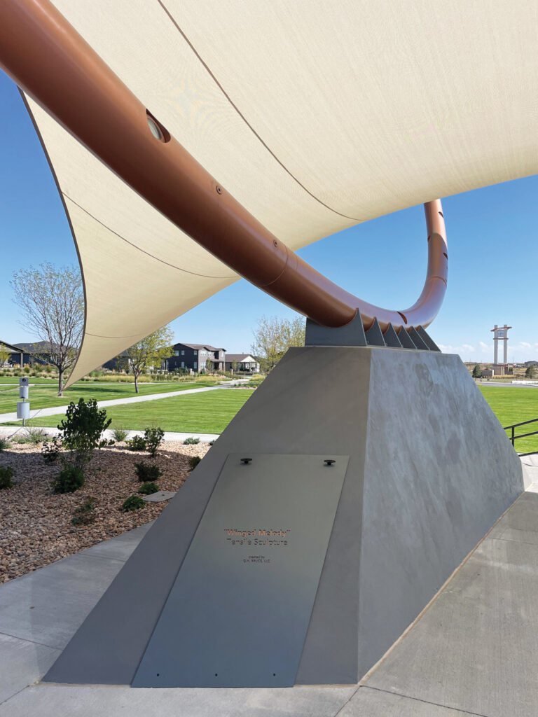 On the wind-swept plains of Aurora, Colo., a monumental tensile structure gives the appearance of a giant winged bird alighting atop a performance stage. The site is part of a planned development for multiple parks for Aurora Highlands east of the Rockies of western Colorado.